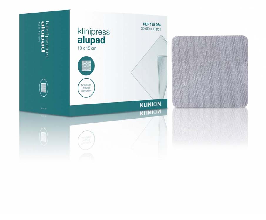 Eine saugfähige, nicht haftende Wundauflage, die zum Abdecken mäßig exsudierender Wunden verwendet wird. Die Alupad-Wundauflage hat eine silberfarbene Aluminiumschicht auf der Wundseite des Verbandes.