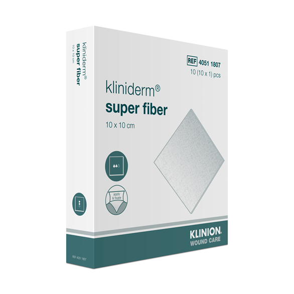Der kliniderm super fiber ist eine sterile Hydrofaser-Wundauflage zum einmaligen Gebrauch, die zu 100 % aus Natriumcarboxymethylcellulose-Fasern besteht. Dieser drapierfähige und stark absorbierende Verband nimmt Wundexsudat auf und bildet ein kohäsives, transparentes Gel, wodurch ein feuchtes Milieu aufrechterhalten wird.